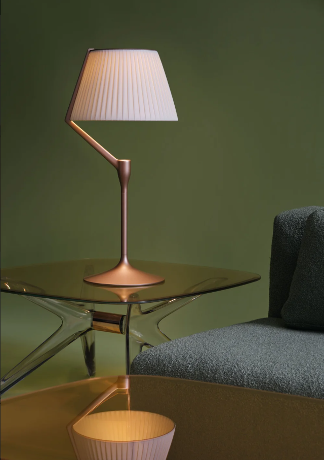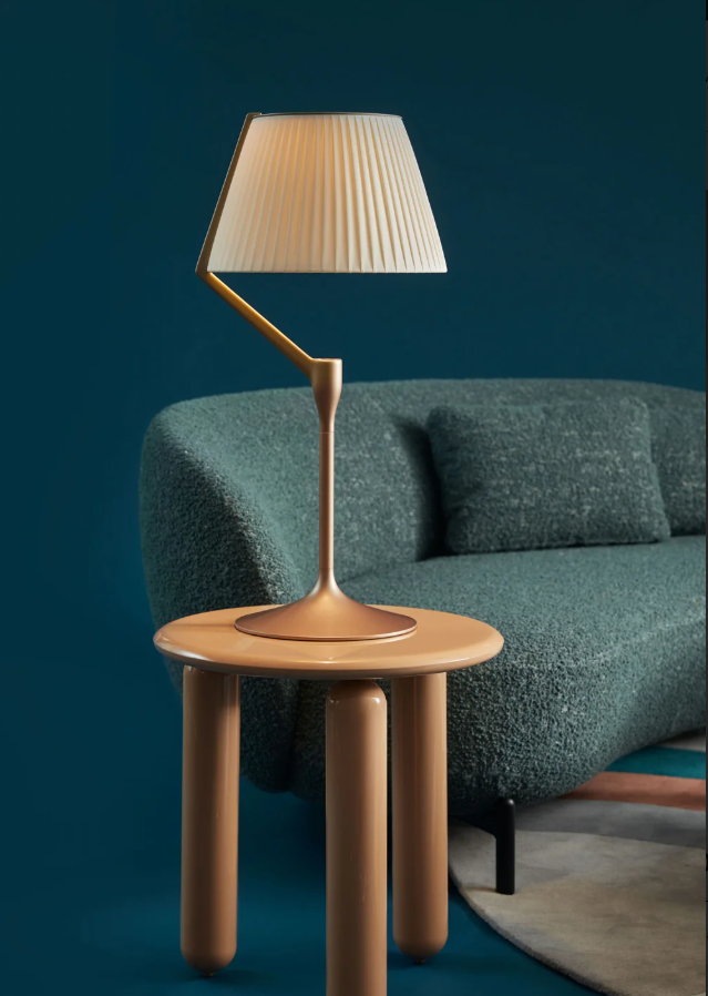 Une lumière généreuse, diffusée et appréciée dans l'espace. La version finale d'ANGELO STONE, la lampe de Philippe Starck qui révolutionne l'agencement ampoule/abat-jour, arrive en boutique : la source lumineuse n'est plus zénithale, mais une LED placée sur la tige qui éclaire le capuchon, point de départ d'un jeu de reflets créé par des lentilles high-tech. Grâce à son abat-jour monobloc moulé en polycarbonate écologique, la lumière est diffusée de façon encore plus homogène. ANGELO STONE est disponible en version lampe de table et lampadaire, et en trois finitions : champagne, cuivre et titane.