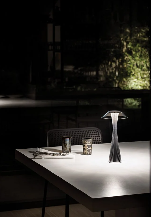 Une lampe de table de forme allongée : sa silhouette rappelle celle de la Space Needle, la tour qui a rendu célèbre l’horizon de Seattle.
