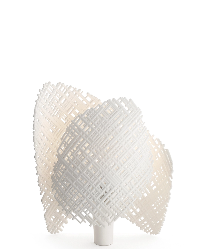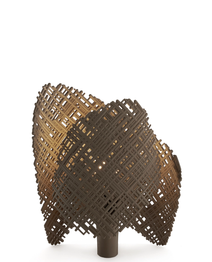TEA est une forme abstraite, un objet à l'empreinte presque artisanale qui semble représenter deux mains tenant une lumière entre leurs paumes et ne laissant s'échapper que des faisceaux irréguliers créant un effet de clair-obscur, comme projetant des ombres sur le mur. Son aspect irrégulier et poreux, choisi pour sa finition extrêmement naturelle, évoquant la terre cue ou le biscuit céramique, est particulièrement novateur. Une gamme de couleurs fondamentales nous permet également de constater que des objets d'une qualité exceptionnelle et d'une grande poésie peuvent être créés même à partir de matériaux recyclés. TEA est fabriqué à partir de technopolymère thermoplastique recyclé et se décline en blanc, anthracite, terre cube et gris-brun.