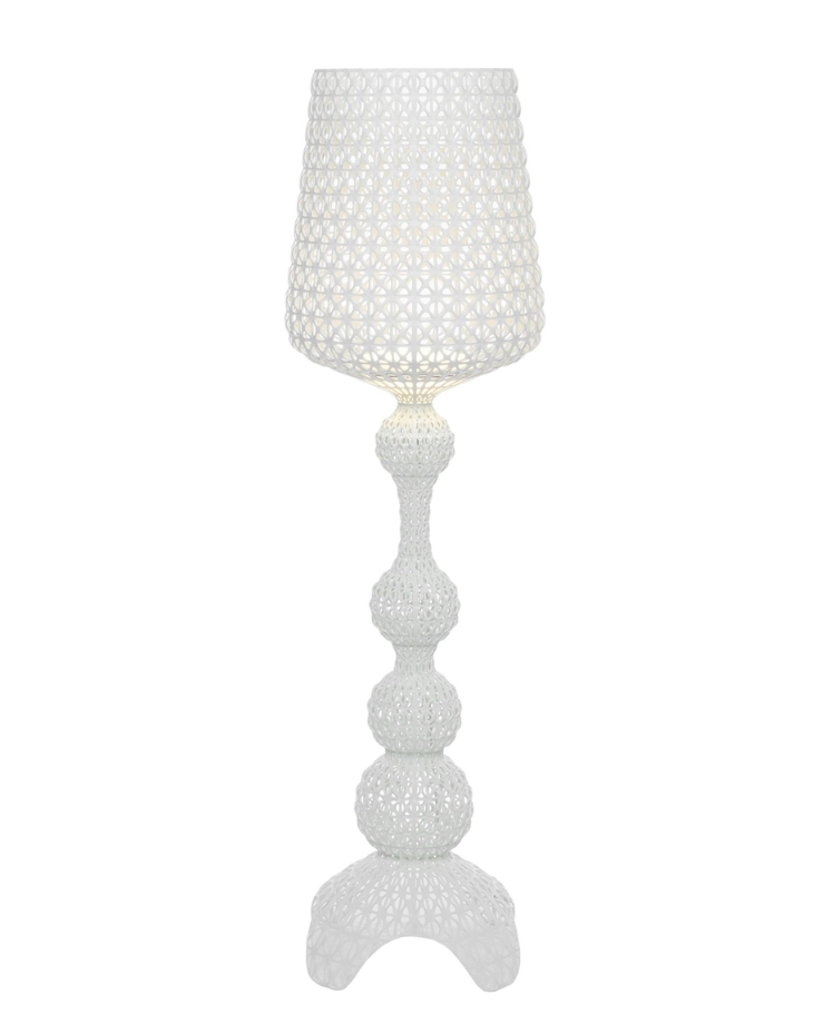Le lampadaire Kabuki est moulé par injection. La technologie employée permet de créer une structure tissée semblable à la dentelle, avec une surface perforée unique qui diffuse la lumière. Disponible en versions intérieure et extérieure.