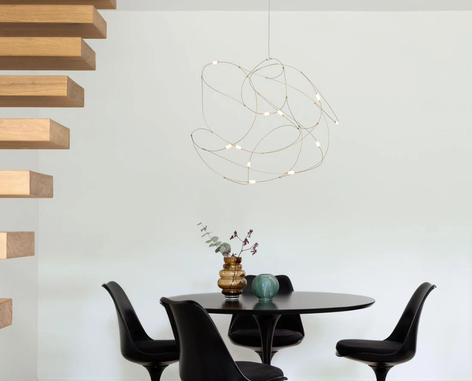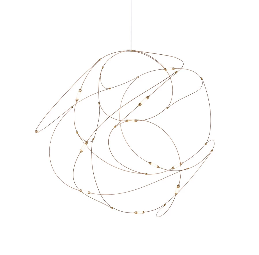 Flock of Light, du Studio Toer, raconte l'histoire de la nature à travers des luminaires inspirés par le mouvement des lucioles. De fins fils de bronze dessinent d'élégantes lignes courbes, tandis que les coupelles en laiton et les diffuseurs LED évoquent des scarabées lumineux dansant dans l'air. Ludique et aérienne, la lumière se métamorphose le jour en un essaim de lumières chaudes la nuit, apportant élégance et chaleur à toute pièce. Spécifications