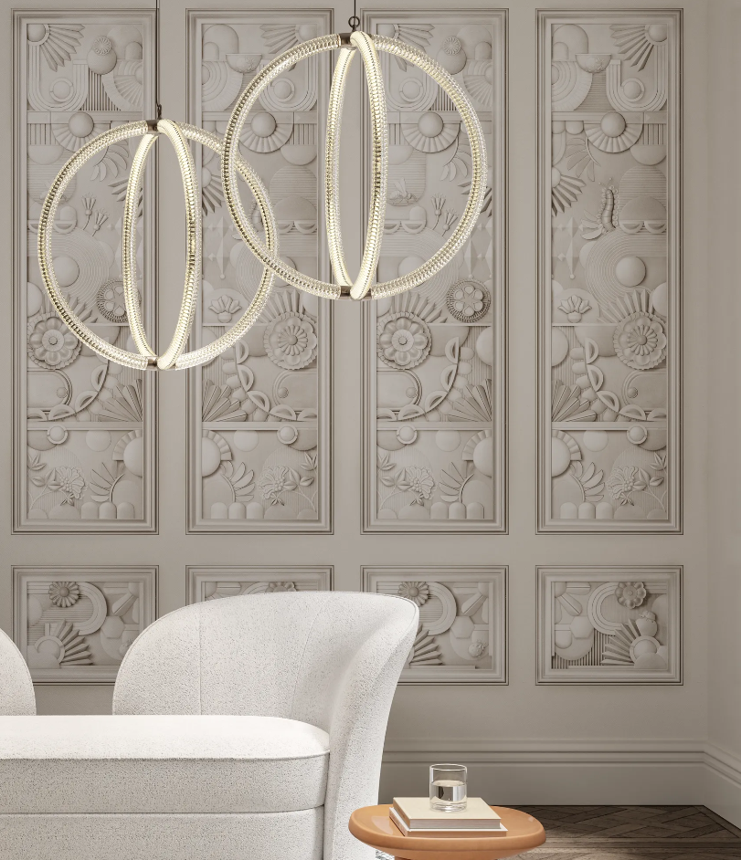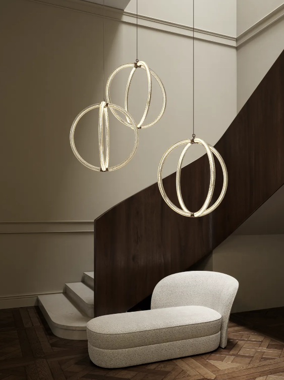 Inspirée par la grandeur du verre de Murano et l'élégance mathématique du nombre d'or, Luminora Light allie savoir-faire artisanal et modernité. Son design aérien incarne la simplicité et la complexité, créant une sculpture lumineuse où la structure est lumière elle-même. Le motif optique en losange en forme de V et les tubes LED transparents produisent un effet hypnotique.