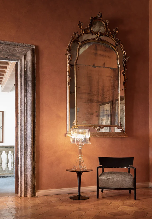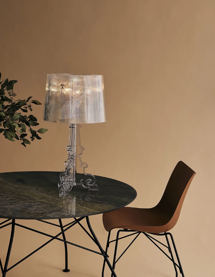 Bourgie allie classicisme, raffinement et tradition à l'innovation technologique. Le pied de style baroque se compose de trois éléments décorés qui s'emboîtent, tandis que le grand abat-jour, plissé, crée une multitude de reflets une fois allumés. Grâce à un système de suspension spécifique, trois hauteurs sont possibles : 68, 73 et 78 centimètres, pour s'adapter aux préférences de chacun et à l'usage prévu.